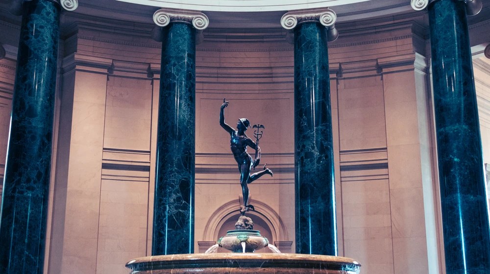 Instead of overlay, the captions are shown at the end of each subsection (i.e., “Statues” or “Paintings”) with reference. The photographs under both subsections are marked with CC0 1.0 Universal.